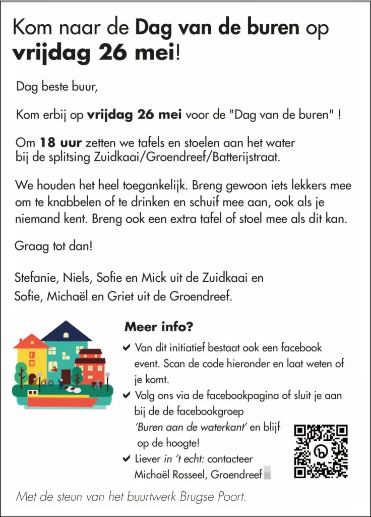 Dag op dag, 11 jaar later, is het vandaag op 26 mei nu net weer toevallig ‘De dag van de buren’. Samen met de Buren aan de Waterkant in de Groendreef help ik mee organiseren met het opstellen van de flyer en is het spannend om te zien wie, buiten het groepje buren waar we het mee organiseren, er vanavond allemaal bij zal zijn.