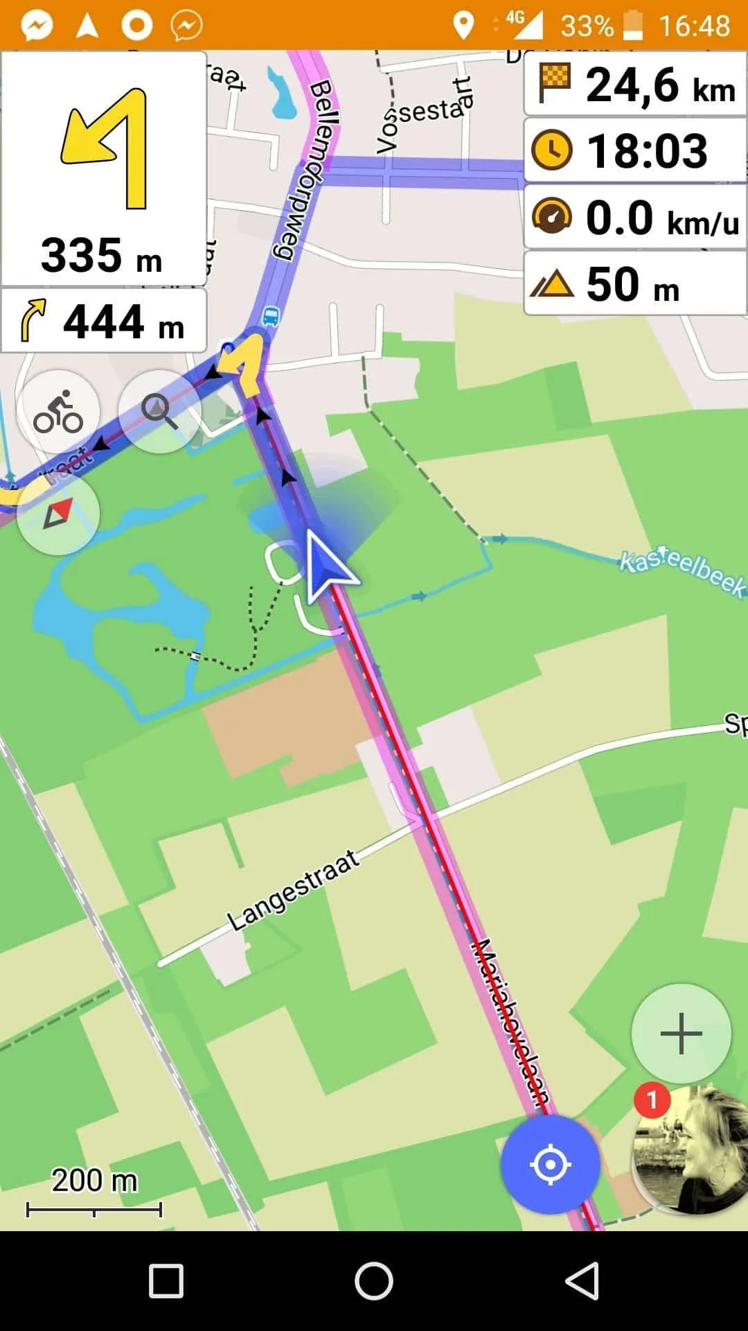 De OsmAnd app liet echt toe meer rond te kijken tijdens het fietsen en meer te genieten van het fietsen zelf. Gewoon een blik op de blauwe pijl en de blauwe route was voldoende om te zien of je nog op de juiste weg zat. En op het kadertje linksboven zag je wat er aan bochtenwerk nog aan zat te komen. De kaart draaide wel niet altijd onmiddellijk mee, en floepte soms eens een andere richting uit, maar veel last had ik er niet van. Ik was op de Strava app de richtingloze bol op een wit canvas gewend. (Ondertussen vond ik dat je de Kaartoriëntatie kunt instellen. Het stond op niet roteren (noorden boven))