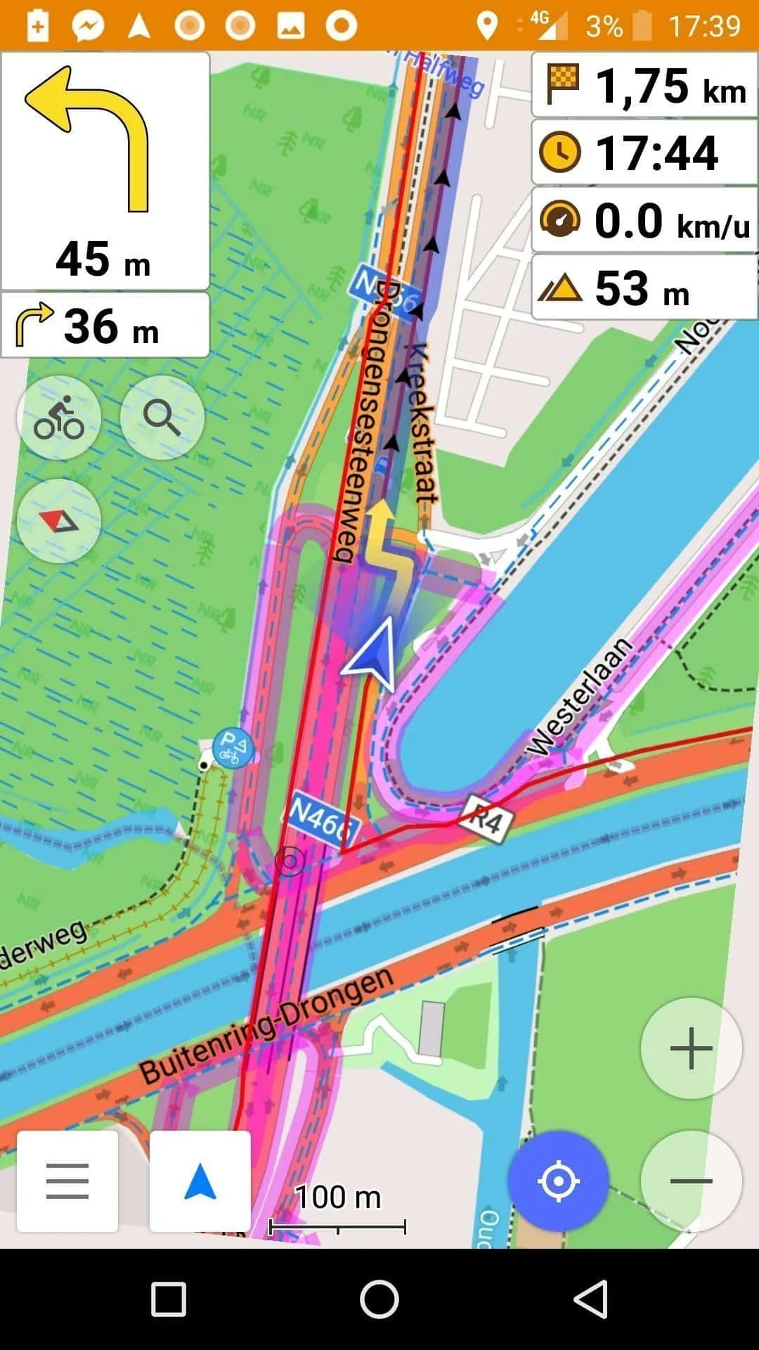 Wat ik tijdens de eerste proefrit het meest miste, was goede handsfree fietsnavigatie. Als je pas begint grotere afstanden te fietsen, niet vertrouwd bent met de streek, niet continu over een scherm wil wrijven, en dus vooral wil genieten van het rijden, is dat eigenlijk onmisbaar. Naast de site van Garmin, vond ik via Jeroen uit Mol hoe je van een android telefoon een poor man’s cycling gps kon maken met behulp van navigatie app OsmAnd en Dropsync. Ik voerde het uit op de Oneplus3 waar ik tegenwoordig alles, en dus ook de Strava tracking mee doe. Maar in principe zou het ook met een oude telefoon zonder SIM-kaart moeten lukken, want de kaarten staan bij OsmAnd offline. Via Dropbox en Dropsync (of rechtstreeks, via Airdroid) plaats je de routes in .gpx formaat vanuit Strava (of ergens anders) in OsmAnd.